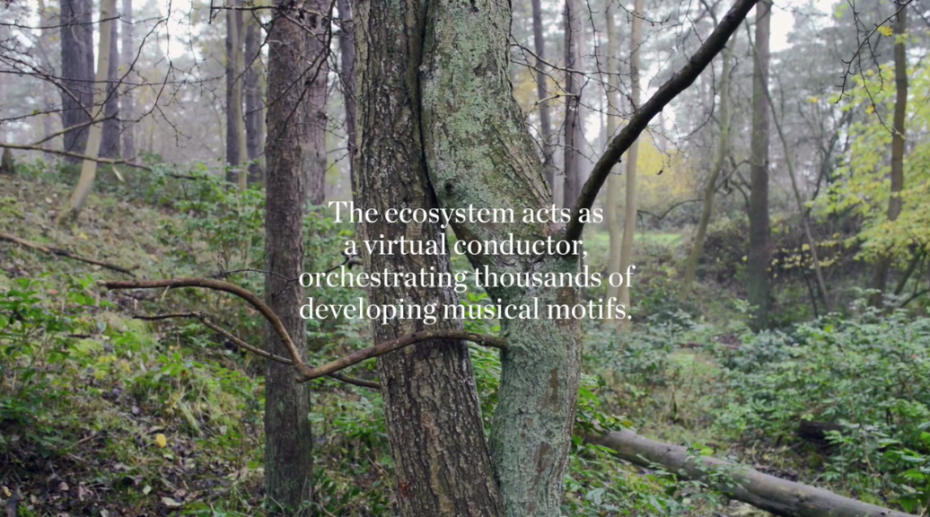 Living Symphonies A landscape sound installation by James Bulley and Daniel Jones that grows in the same way as a forest ecosystem. It portrays the thriving activity of the forest's wildlife, plants and atmospheric conditions, creating an ever-changing symphony heard from a network of speakers hidden throughout the forest itself. Source: Vimeo.